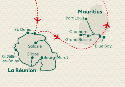Auf diesem Ausflug kommen Sie dem Vulkan von La Réunion ganz nahe. Vom Hotel aus brechen Sie auf in den üppig grünen Hochlandort Bourg-Murat, der auf rund 1600 Metern Höhe liegt und als Tor zum berühmten Vulkan Piton de la Fournaise gilt. Vom Aussichtspunkt Nez de Bœuf, was übersetzte die «Ochsennase» bedeutet, blicken Sie tief in eine zerklüftete Schlucht, deren dramatische Felswände vom gewaltigen Einsturz eines früheren Kraterkessels erzählen. Diese erste Caldera entstand durch den Zusammenbruch der Spitze des Vulkans vor Tausenden von Jahren. Weiter geht es hinauf zum Pas de Bellecombe, ein Aussichtspunkt, der sich auf etwa 2310 Metern Höhe befindet. Vor Ihnen erhebt sich nun einer der aktivsten Vulkane der Welt: der Piton de la Fournaise. Sein symmetrischer Kegel ragt bis auf 2630 Meter. Mit etwas Glück sehen Sie Rauch aufsteigen, ein Zeichen seines ewigen Lebens. Der Vulkan ist nicht gefährlich, aber lebendig. Seine letzten Ausbrüche sind gut dokumentiert und gehören zur Identität der Insel. Ein kurzer Abstecher führt Sie zum Commerson-Krater, einem rund 200 Meter tiefen Explosionskrater, der von einem der heftigsten Vulkanausbrüche in der Geschichte der Insel zeugt.
