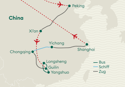 Eindrückliche Tradition und Moderne in China: Eine tolle Kombination. Besuchen Sie das geschichtsträchtige Peking und geniessen Sie im boomenden Shanghai das Grossstadtleben. Die mystische Landschaft von Guilin und die berühmte Terrakotta-Armee in Xian werden Sie begeistern.