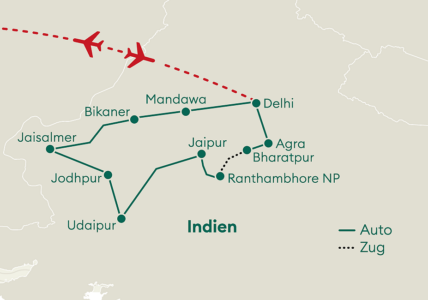Grossartige Paläste und Bauwerke prägen Rajasthan seit Jahrhunderten. Erleben Sie die Schönheit ganz Rajasthans! Die Reise beginnt in der Hauptstadt New Delhi, führt über Mandawa zu den Wüstenstädten mit Ihren grossen Forts nach Bikaner und Jaisalmer im Nord-Westen. Udaipur am Pichola See, bekannter James Bond Drehort, Rajasthans Hauptstadt Jaipur, der Ranthambhore Nationalpark mit Tiger-Pirschfahrten und der Besuch des Taj Mahal in Agra bilden die zweite Hälfte der Reise.