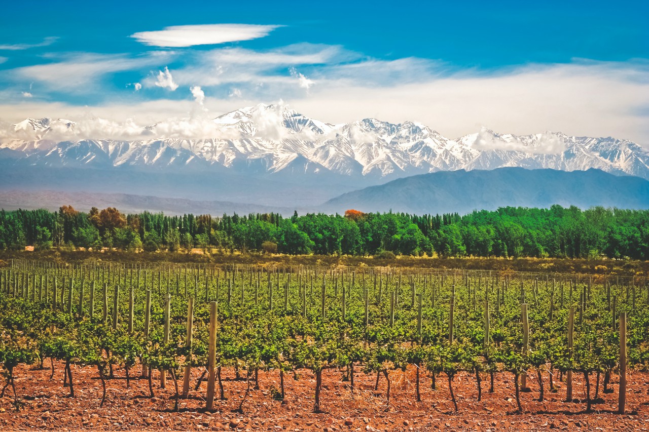 Im Vordergrund ist ein Weinbaugebiet zu sehen in dessen Hintergrund sich die schneebedeckten Gebirgszüge der Anden erheben.
